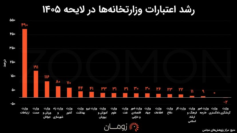 طبق لایحه بودجه از بین ۱۹ وزارتخانه دولت، بیشترین رشد اعتبارات مربوط به وزارت ارتباطات و فناوری اطلاعات است. بودجه این وزارتخانه در سال آتی ۴۹۰ درصد رشد خواهد کرد و به ۳۰.۳ هزار میلیارد تومان خواهد رسید. این عدد فقط بودجه مختص این وزارتخانه بدون احتساب شرکتهای وابسته آن است.