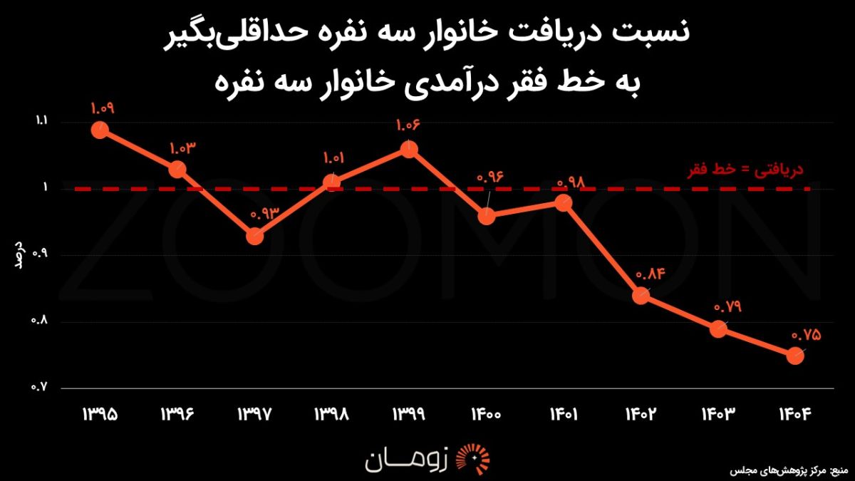 طبق دادههای تحلیلی در گزارش جدید مرکز پژوهشهای مجلس، وضعیت برای سال ۱۴۰۴ نگرانکنندهتر از همیشه پیشبینی شده است. این گزارش پرده از این واقعیت برمیدارد که درآمد یک خانواده سه نفره که حداقل حقوق را دریافت میکنند، در سال پیشرو تنها به ۷۵ درصدِ خط فقر درآمدی رسیده است. یعنی حتی درآمد بسیاری از خانوارها حتی از خط فقر هم پایینتر است.