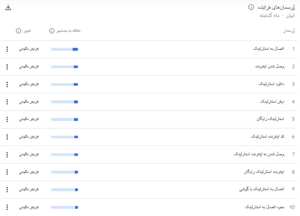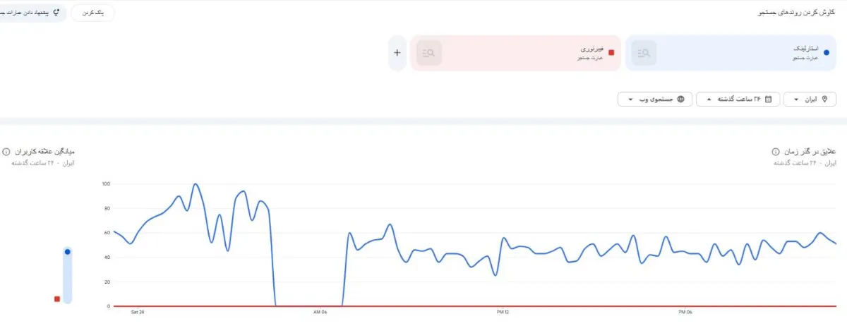 حالا با این مقدمه، کافیست نگاهی به آخرین وضعیت جستوجوی دو کلمه «استارلینک» و «فیبرنوری» در گوگل بیندازیم: