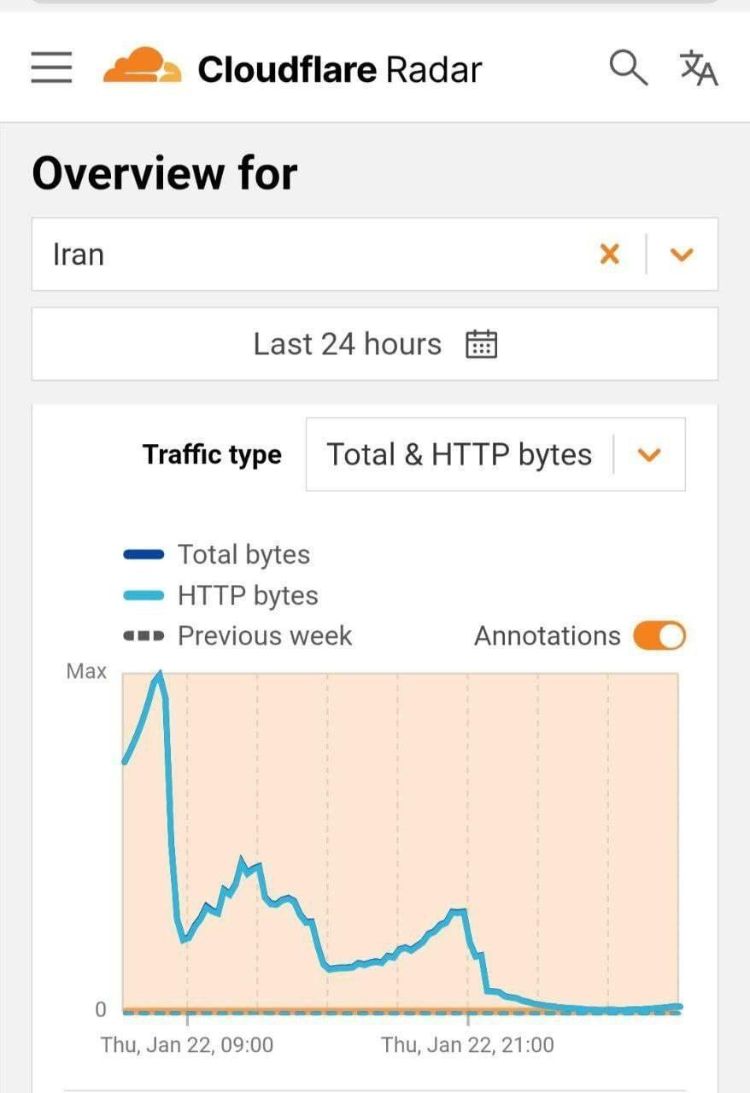 دنیای اقتصاد، با دسترسی آزادی که به اینترنت جهانی دارد، تصویری از رادار کلادفلر منتشر کرده که نشان از کاهش شدید پهنای باند اینترنت کشور دارد. در این تصویر دیده میشود که در ساعت ۲۱ پنجشنبه ۳ بهمنماه (۲۲ ژانویه) ترافیک اینترنت ایران بالا بوده و از همان ساعت بهتدریج رو کاهش پیدا کرده است.